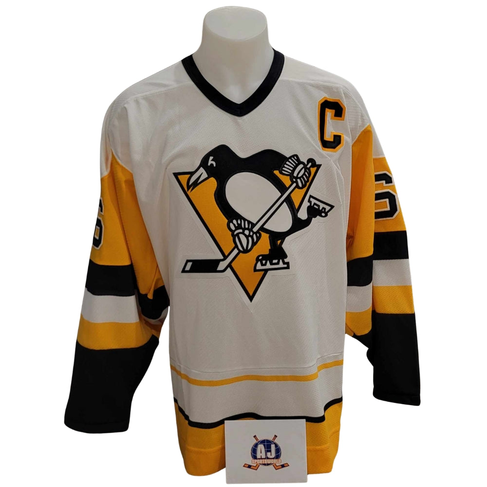 Chandail officiel CCM vintage signé - Mario Lemieux blanc AJS coa